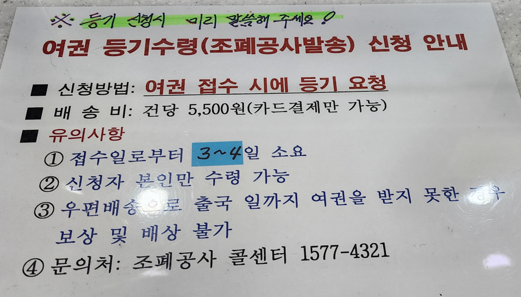 - 신청서 제출 시 여권 발급 예정일을 안내받을 수 있습니다.