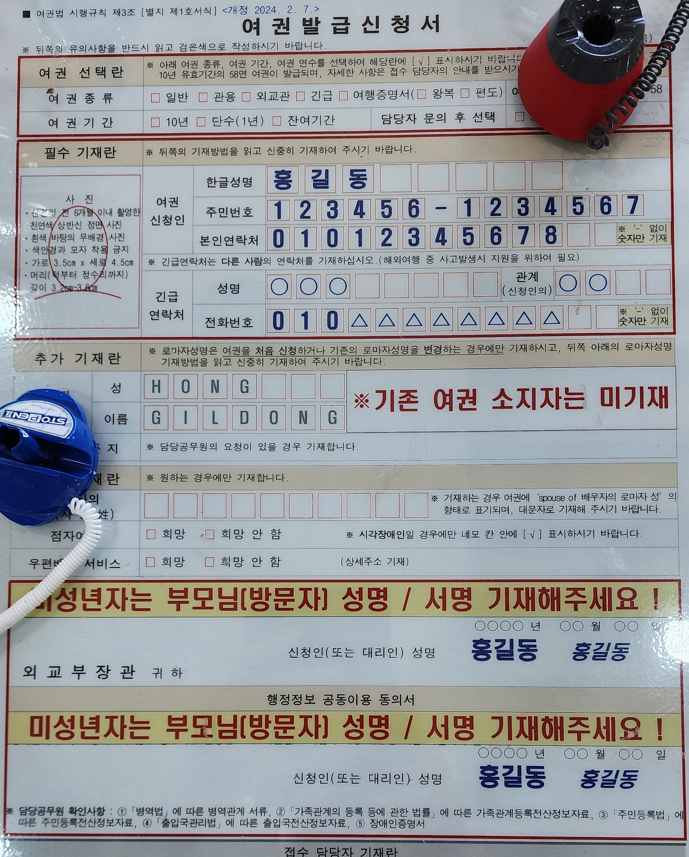 - 여권 발급 신청서의 모든 항목을 빠짐없이 작성하고, 법정대리인의 서명을 받아야 합니다.