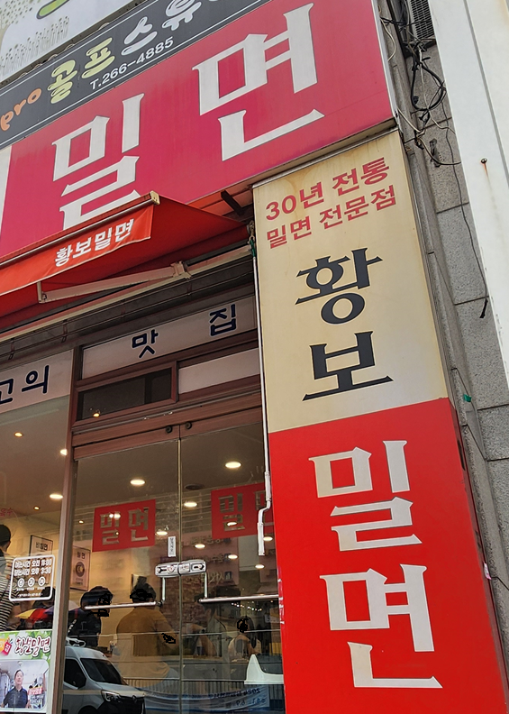 무더운 여름날, 상남동을 걷다가 더위에 지친 몸과 입맛을 달래줄 무언가를 찾고 있었습니다. 그러던 중, 상남시장 맞은편에서 빨간 배경에 흰 글씨로 '밀면'이라고 진하게 적힌 간판이 눈에 띄었습니다.