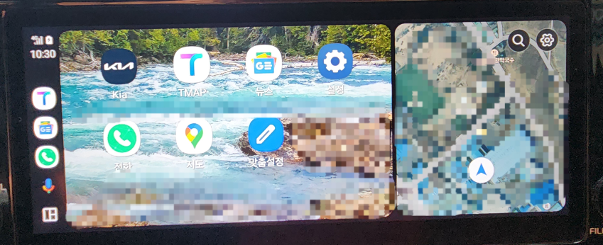 연결이 완료되면 차량 화면에 두 개의 분할 화면이 나타납니다. 작은 뉴스 화면을 터치하면 큰 화면으로 이동하고, 큰 화면의 티맵은 작은 화면으로 이동합니다. 필요에 따라 적절히 사용하면 됩니다. - 메뉴 사용