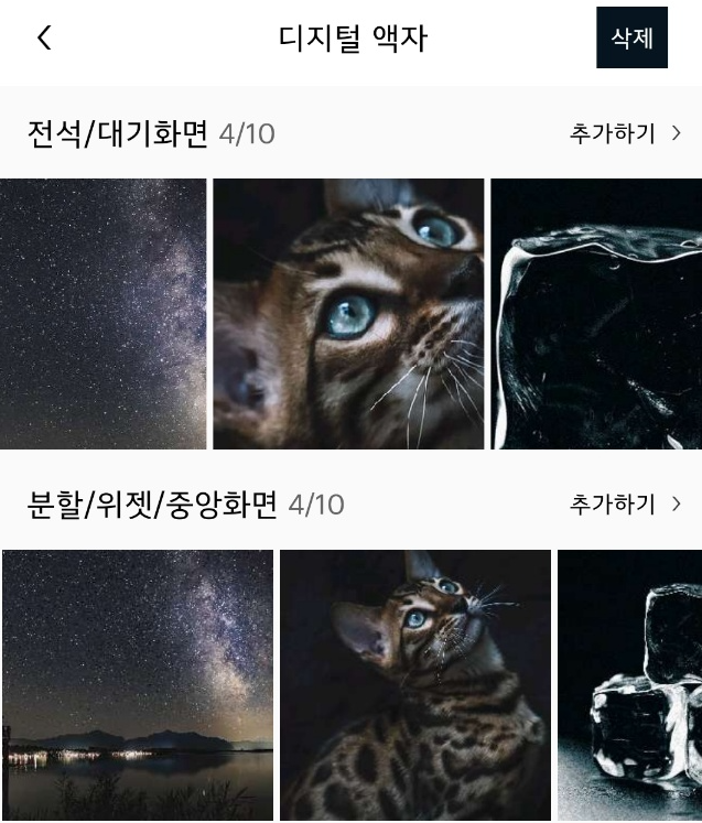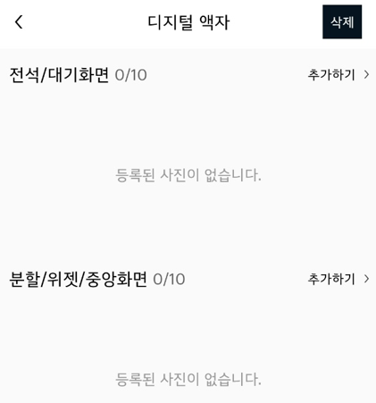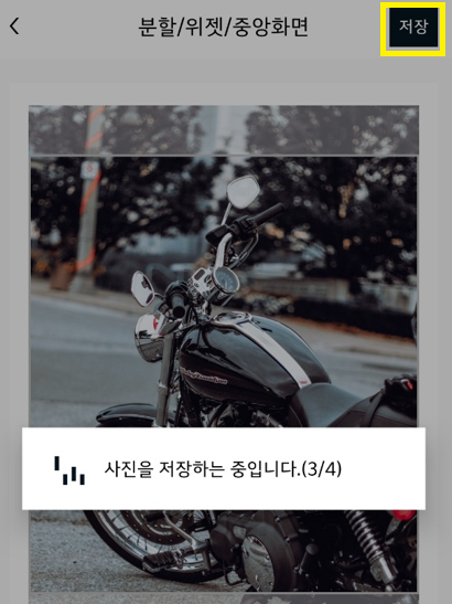- 사진 추가 및 분할 화면 선택: 여러 사진을 하나의 화면에 분할하여 표시할 수 있습니다. 원하는 사진을 선택 후 추가 하고 저장을 해주세요.