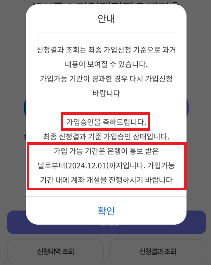 가입신청 결과 확인 방법은 아래 신청내역 조회를 통해서 확인이 가능합니다. 그리고 가입승인이 되었으면, 아래 안내 날짜까지 계좌 개설을 진행하셔야 합니다.