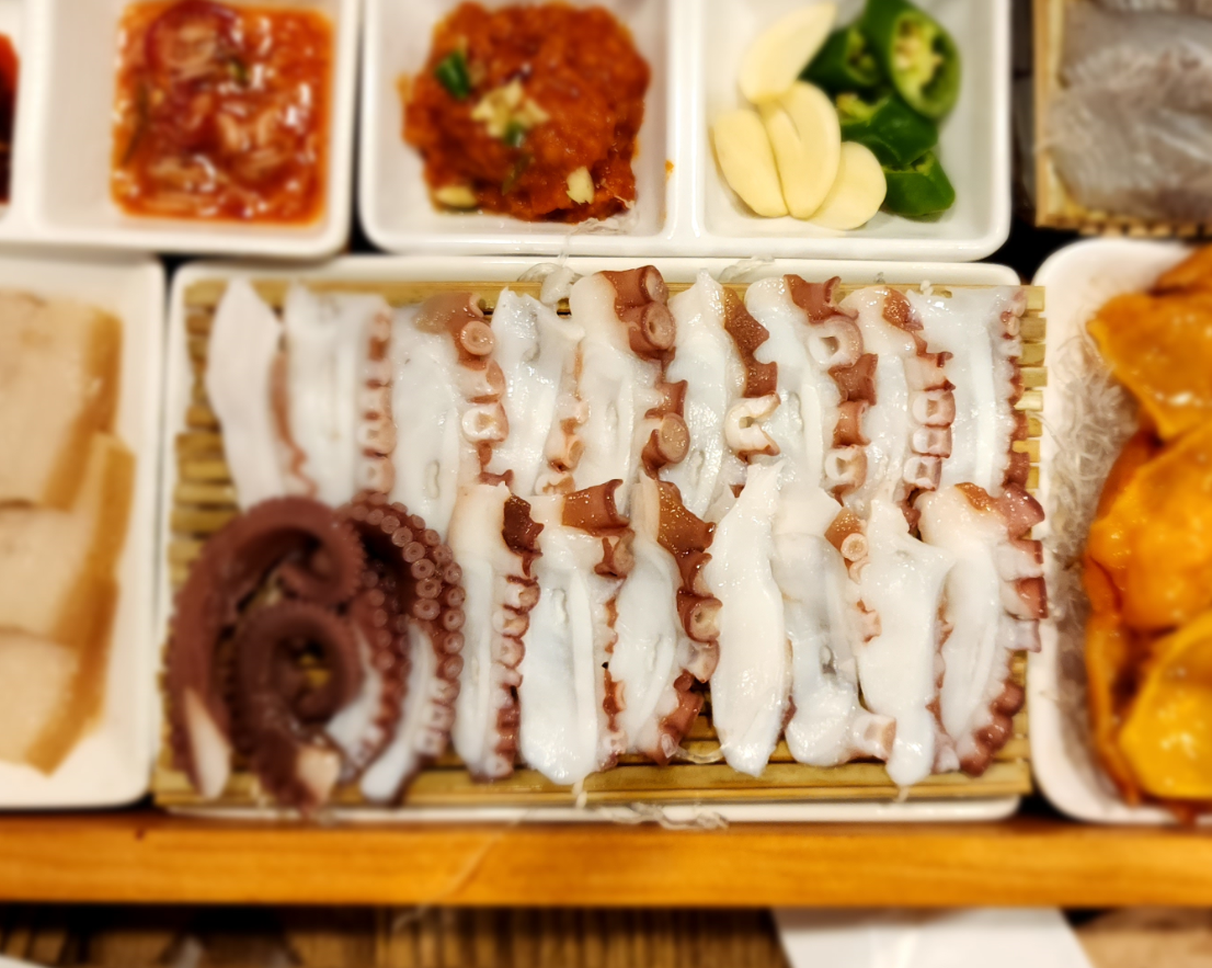 '문씨네'의 가장 큰 상차림입니다. 마치 잔치상처럼 화려하게 차려진 음식들은 보는 것만으로도 감탄을 자아냅니다. 특히, 해산물이 주를 이루는 메뉴들은 신선하고 다양한 맛을 자랑합니다. 싱싱한 회부터 탱글한 새우, 맛있는 전복까지, 해산물 잔치상이라 불러도 손색이 없습니다.