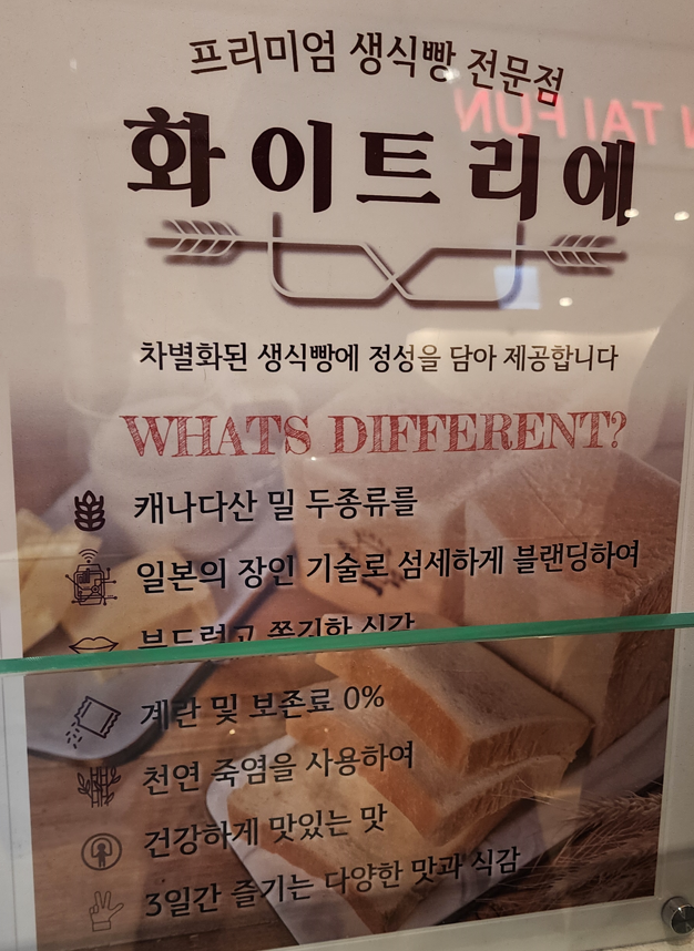 화이트 리에 식빵은 두 가지 종류의 최상급 캐나다산 밀, 생크림, 연유, 프리미엄 대나무 소금을 혼합하여 만들어지고, 첨가물이나 방부제는 전혀 들어가지 않았다고 합니다. 또한, 화이트 리에는 최근 24시간 이내에 구운 빵만 판매하고 신선함을 강조하고있네요.