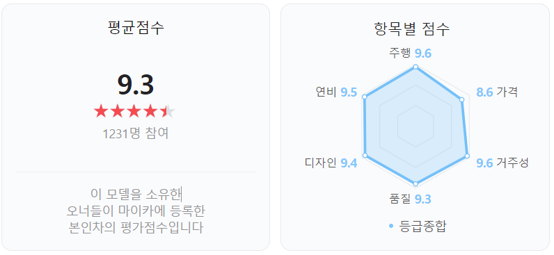 정부 신고 연비 (19inch 기준) | 복합(11.4) / 도심(9.8) / 고속도로(14.0) | 복합(10.3) / 도심(8.8) / 고속도로(13.0) |