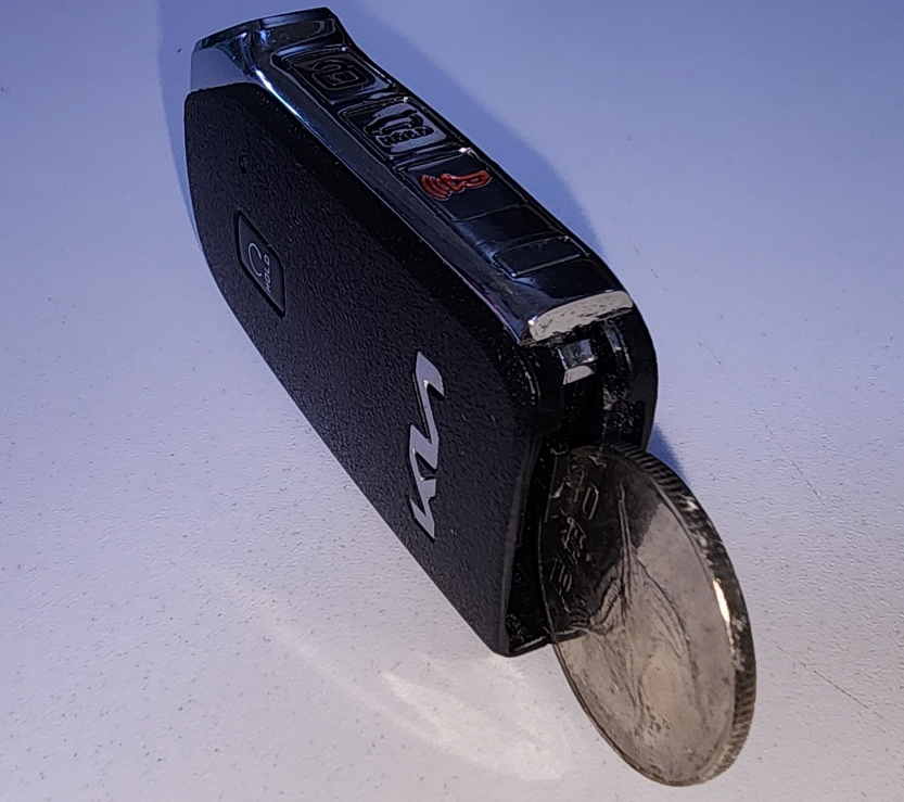 - 메인 키를 분리한 후, 스마트키의 몸체에 작은 홈이 보일 겁니다. 이곳에 500원짜리 동전을 끼우고 시계 방향으로 돌려주면 스마트키가 반으로 분리됩니다. 50원짜리 동전도 사용할 수 있지만, 힘이 더 많이 들어가므로 500원짜리 동전을 추천합니다.